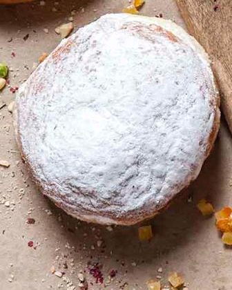 Pączek pieczony z konfiturą z płatków róży z lukrem i płatkami róży